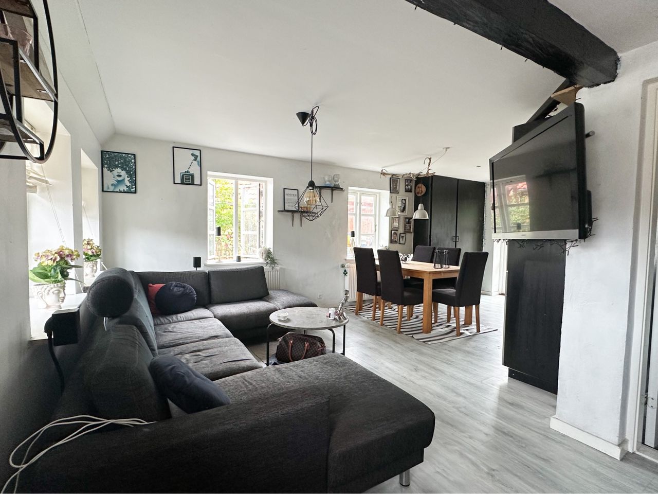 Alrum med nyere køkken , spisebordsplads og plads til sofa - fra køkkenet er der udgang til den lukkede