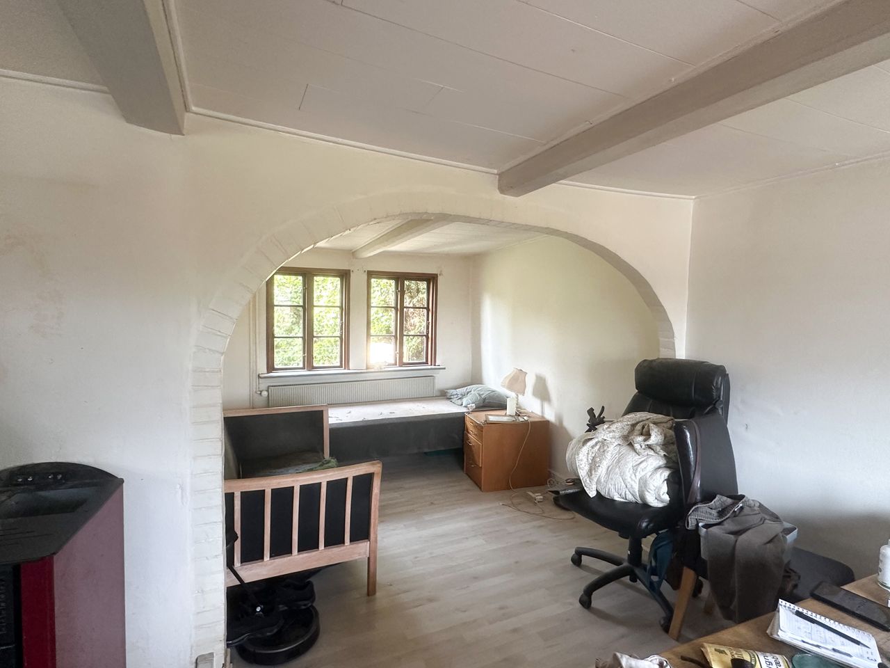 stue i vinkel med klikgulv - pilleovn centralt placeret i husets alrum.