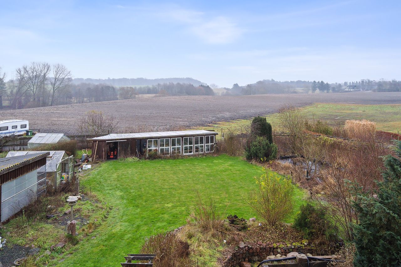 Udbygning med dobbelt porte ind, støbt gulv og isoleret større "kontor", udhus, havehus med glasvæg mod haven(Ikke i BBR), flisebelagt gulv og strøm - perfekt til familiefester, orangeri eller hvad du ønsker.
