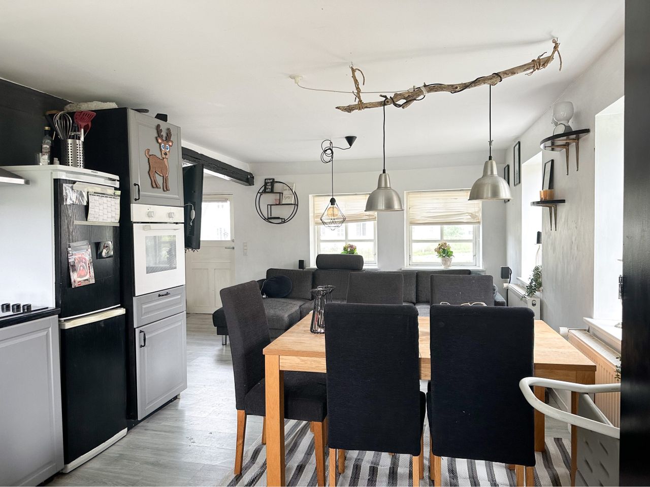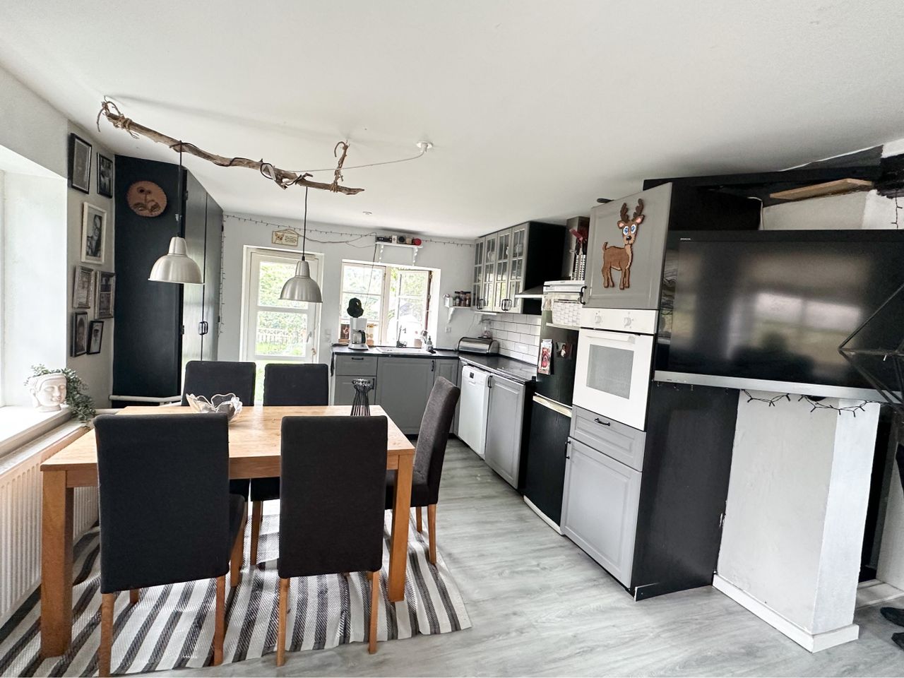 Alrum med nyere køkken , spisebordsplads og plads til sofa - fra køkkenet er der udgang til den lukkede
