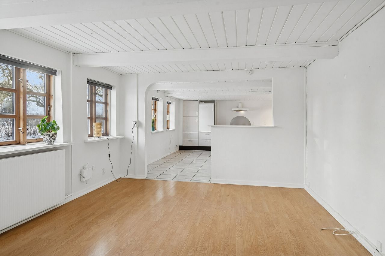 større køkken alrum /stue med køkken i nutidig pæn standard, rummet er aflangt og der er plads til både spisebord, soveafdeling mv.