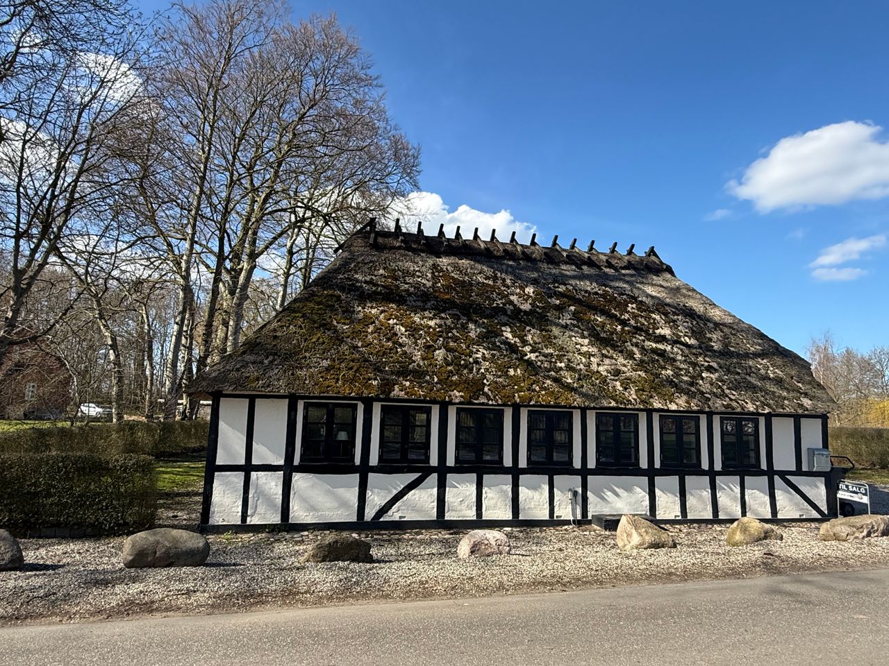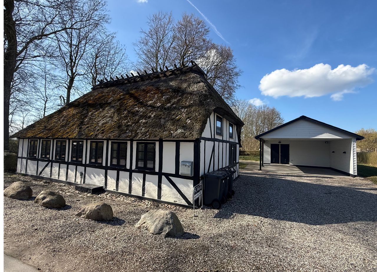 Villaen der ligger på større grund, er opført i bindingsværk og stråtag indeholder :