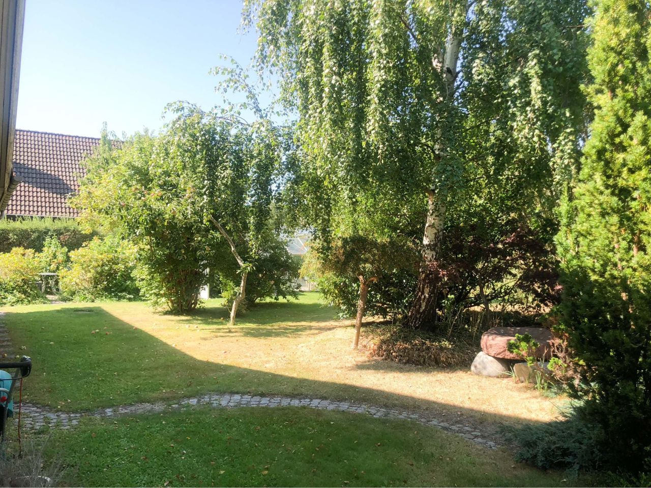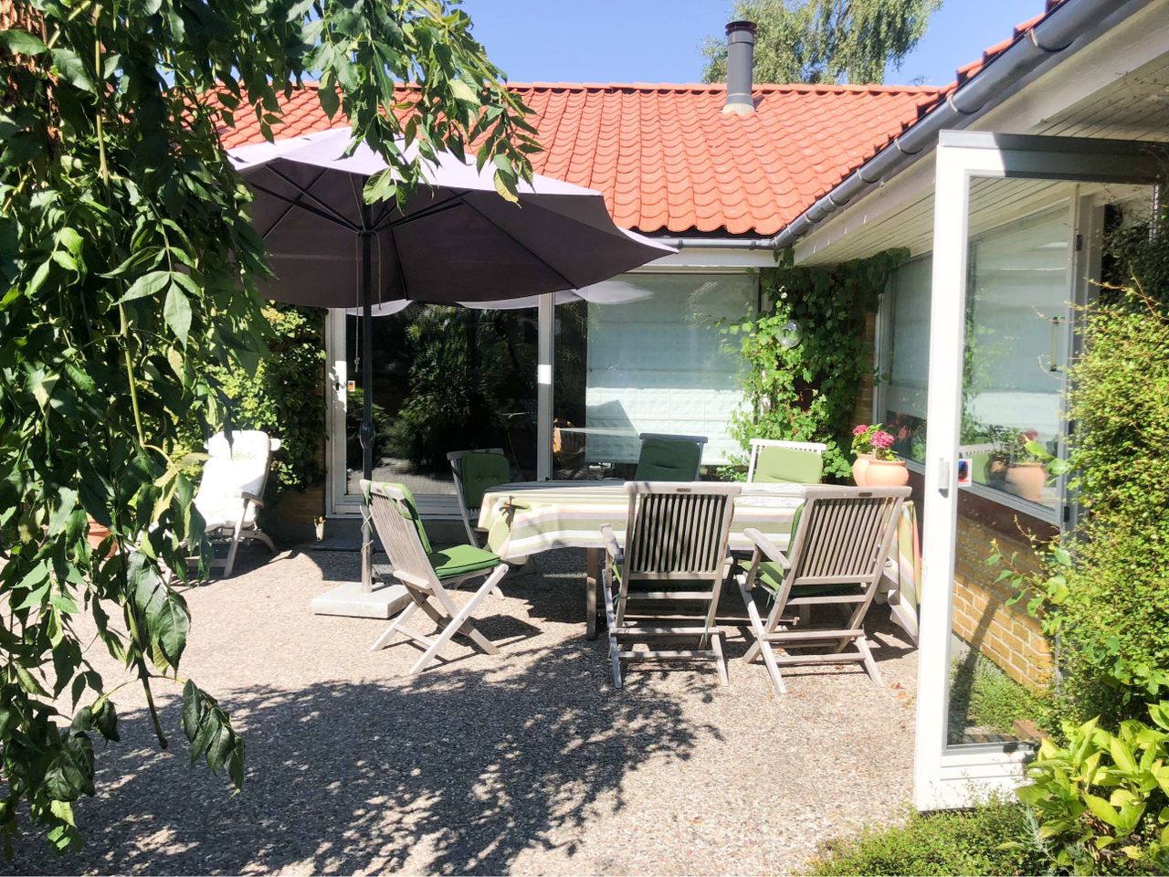 Indtil huset fra stor carport på 31 kvm - flisebelagt holdeplads foran huset, skøn gårdhave med mange