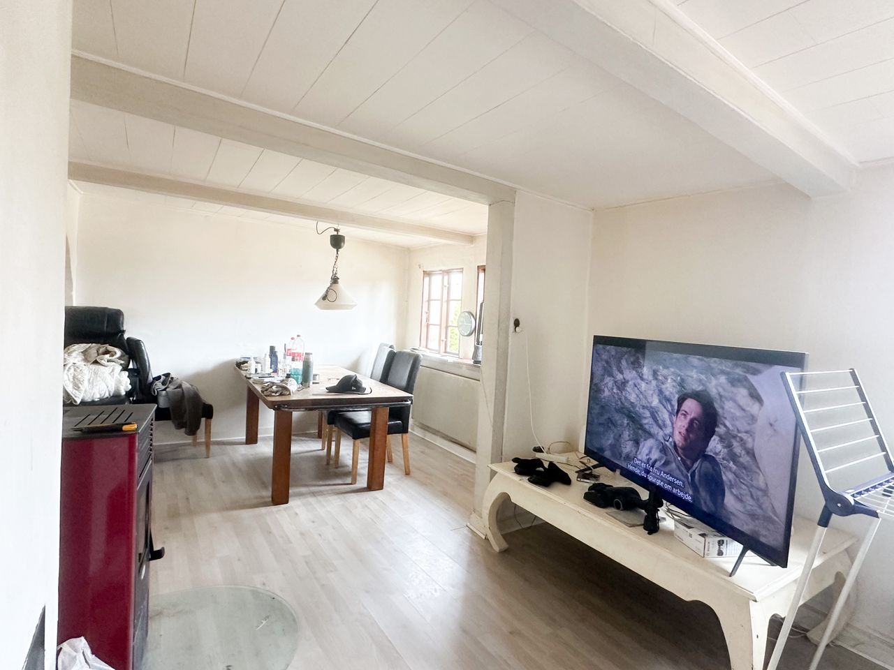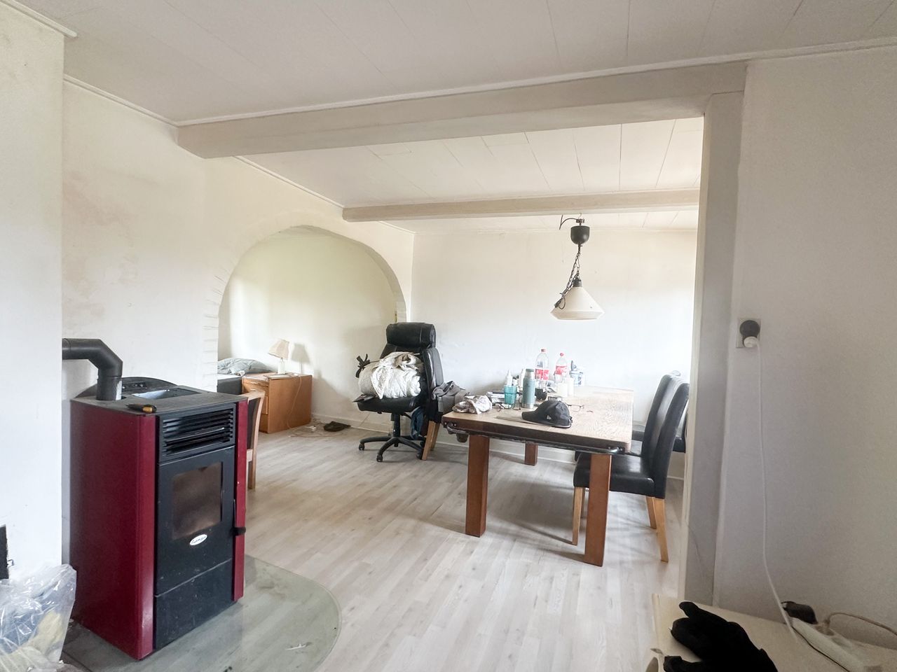 stue i vinkel med klikgulv - pilleovn centralt placeret i husets alrum.