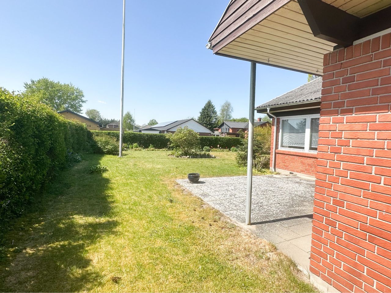 skøn have med lav beplantning, terrasse og god plads.