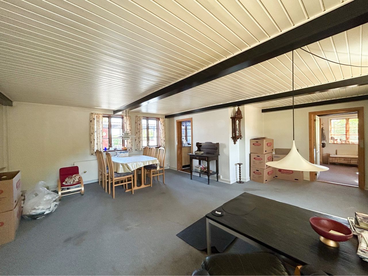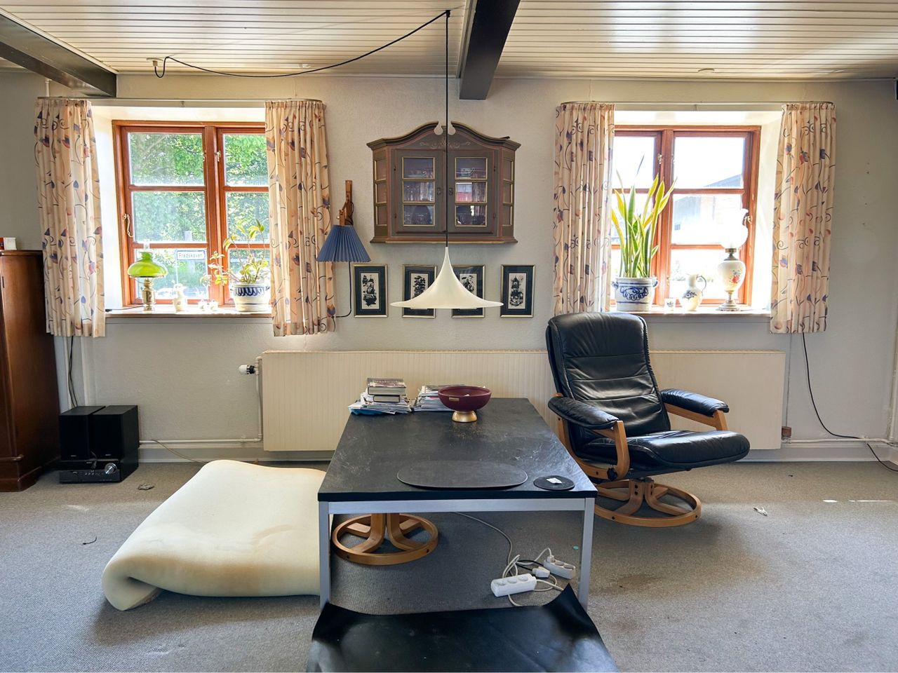 større vinkelstue med støbt glv under tæppe,