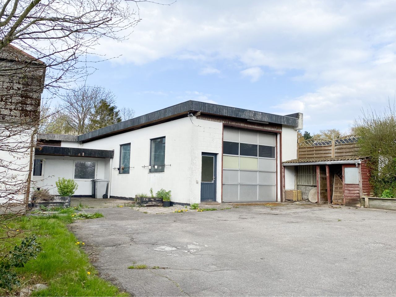 Værkstedet er et stort lokale med op til anslået 4 meter til loftet, klinkegulv og med port ind fra begge